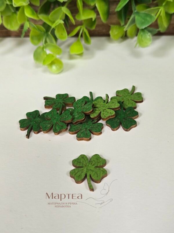 Лазерно рязан дървен елемент – зелена четирилистна детелина. Цената е за опаковка от 10 броя. Подходящи са за декорация на сувенири, картички, различни предмети и други крафт проекти. Размер: 2х1.7 см.