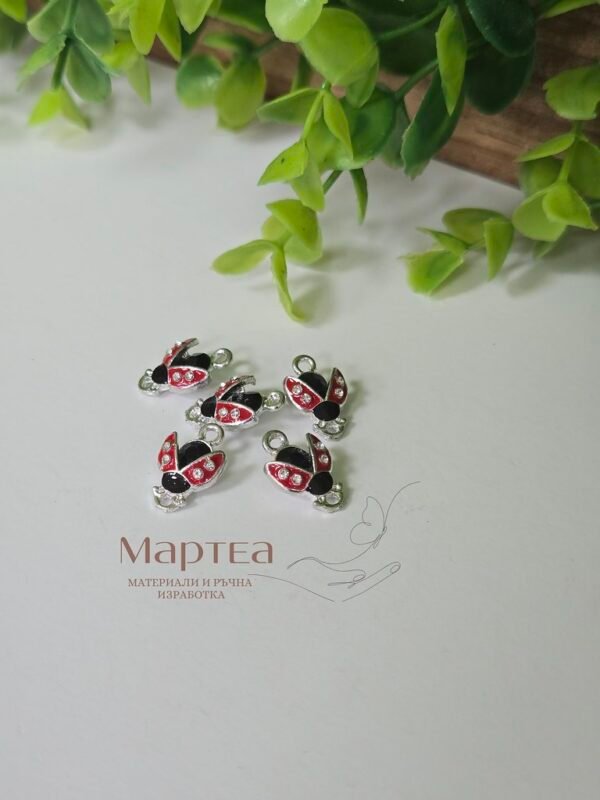 Свързващ елемент с формата на калинка с отворена крила – декоративен елемент с отвор от двете страни, подходящ за свързване на части при изработка на гривни, колиета, мартеници и аксесоари. Изработен от лек метал с покритие, устойчиво на износване. Лесен за прикрепване с връв, корда или халки. Подходящ за ръчна изработка и тематични проекти.