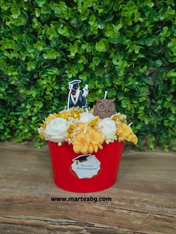 Отбележете един от най-важните моменти с тази стилна и символична аранжировка от соеви свещи. Композицията съчетава нежни цветя и очарователно бухалче – символ на знанието и мъдростта, превръщайки я в перфектен подарък за дипломиране.