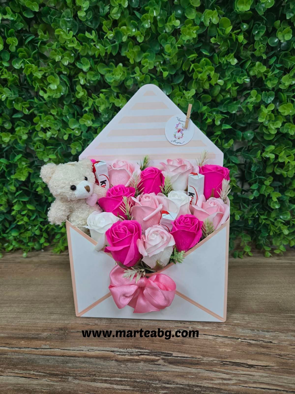 Стилен и впечатляващ подаръчен комплект, аранжиран в елегантна кутия във формата на плик. Нежната комбинация от сапунени рози в бяло и розово, плюшено мече и сладки изкушения го правят перфектен избор за 8 март, рожден ден или друг специален повод.