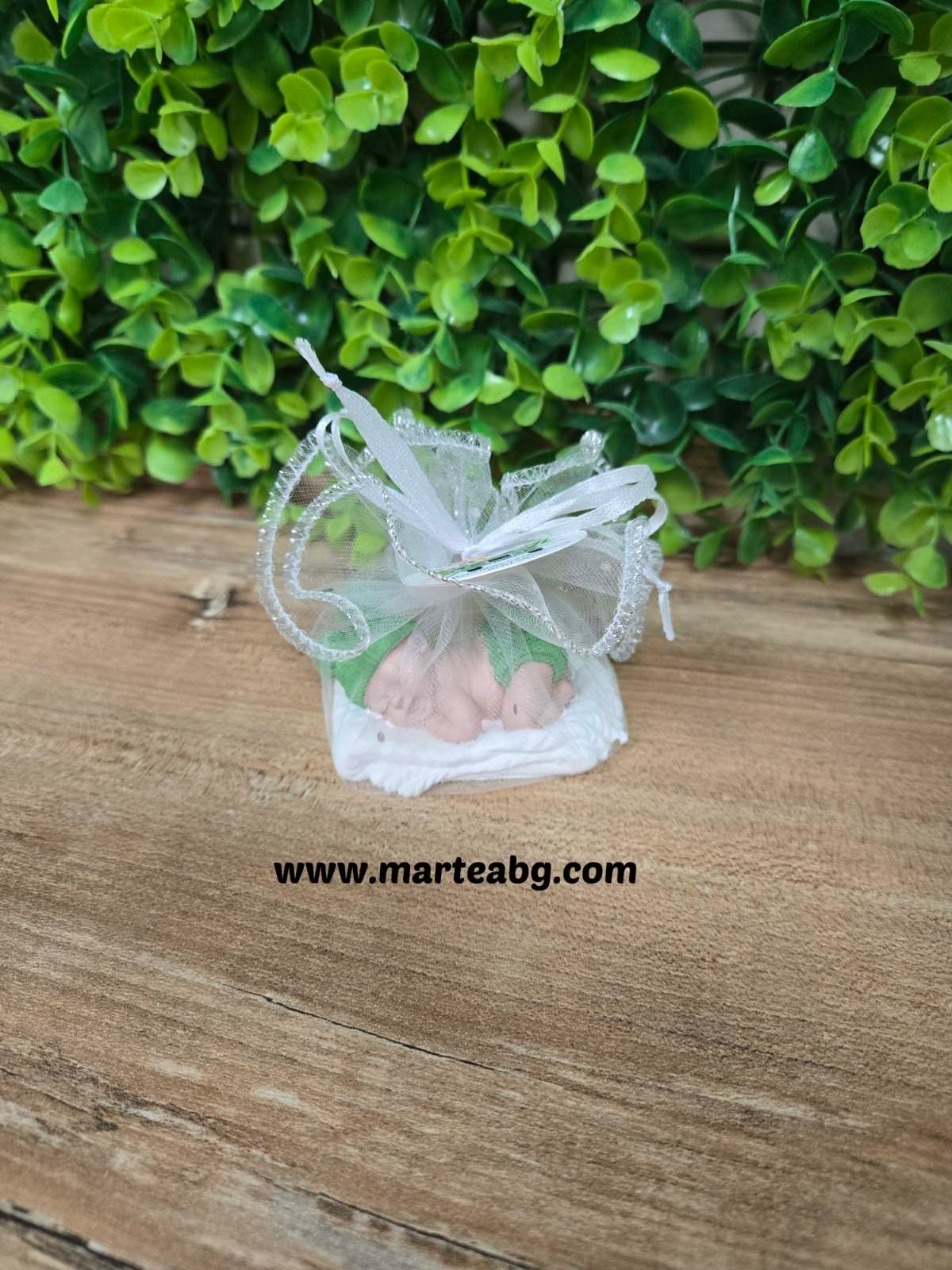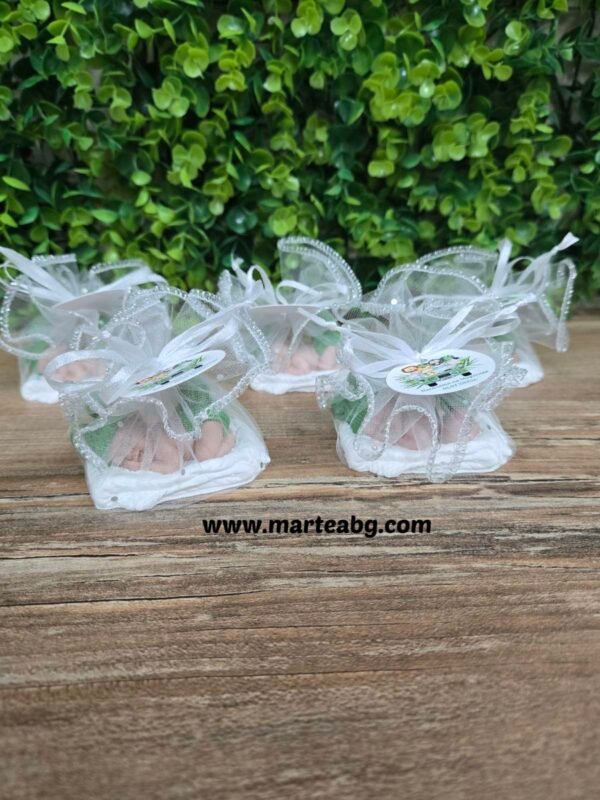 Фигурката е елегантно обвита в ефирен тюл, който придава завършен и изискан вид, превръщайки я в прекрасно подаръче за гости на кръщене, бебешко парти или друг специален повод.