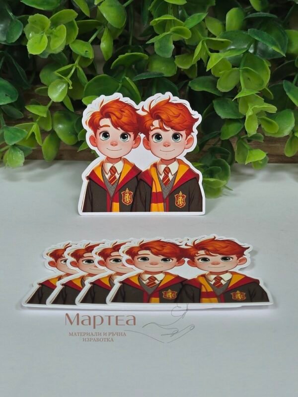 Декоративен картонен елемент във форма на Братята Уизли – прецизно изрязан от плътен, безкиселинен картон с гладка повърхност. Подходящ за скрапбукинг, картички, албуми, кутии и тематични декорации; може да се оцветява, лакира или наслагва за изразен 3D ефект. Лекият материал залепва лесно с лепило, двустранна лента или пяна точки и придава чист, професионален завършек на всеки творчески проект