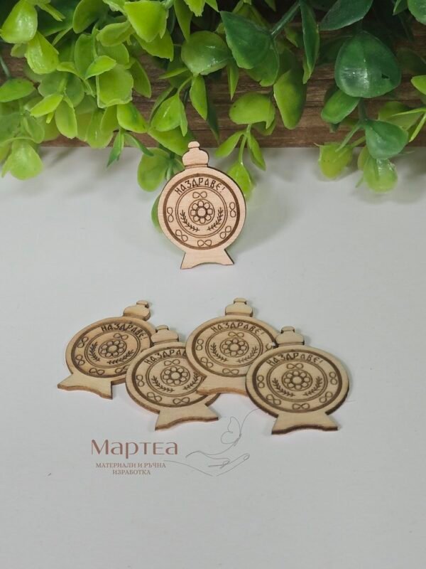 Бъклица с гравирани елементи и надпис Наздраве – лазерно изрязани дървени елементи с гравирани детайли. Цената е за комплект от 5 броя. Подходящи са за украса на различни изделия, изработка на магнити, мартеници, сувенири и други крафт проекти.