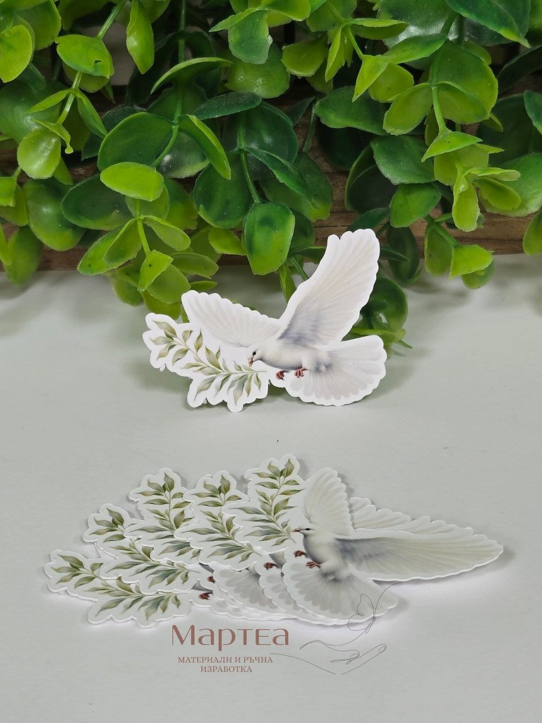 Декоративен картонен елемент във форма на гълъб – прецизно изрязан от плътен, безкиселинен картон с гладка повърхност. Подходящ за скрапбукинг, картички, албуми, кутии и тематични декорации; може да се оцветява, лакира или наслагва за изразен 3D ефект. Лекият материал залепва лесно с лепило, двустранна лента или пяна точки и придава чист, професионален завършек на всеки творчески проект