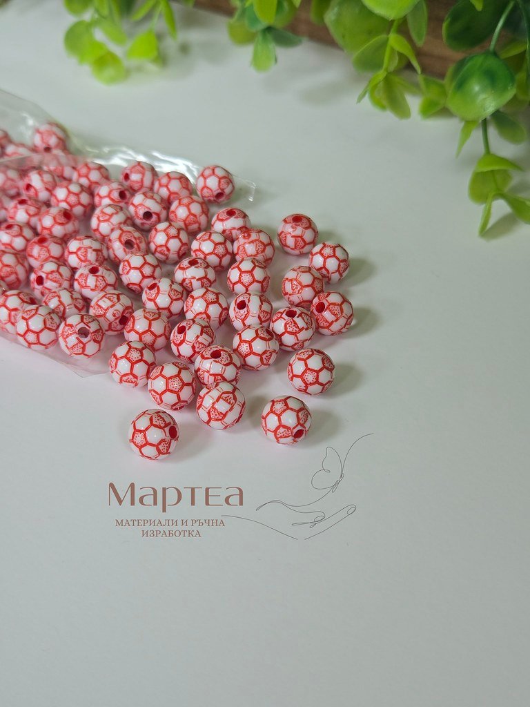 Ръчно изработено двуцветно футболно топче от фини мъниста, прецизно нанизани в класическия шест­ъгълен мотив. Компактният му размер  го прави идеално за спортни гривни, ключодържатели, скрапбукинг или тематична парти украса. Леката, но здрава конструкция с блестящи стъклени мъниста придава динамичен акцент и носи духа на играта във всяко проектче или подарък за футболен запалянко.