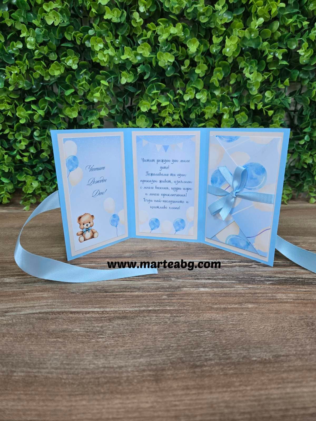 Картичката е изработена с три отделни секции, които позволяват красиво подреждане на послание и място за поставяне на паричен подарък. Допълнена е с декоративна панделка за по-елегантен завършек.