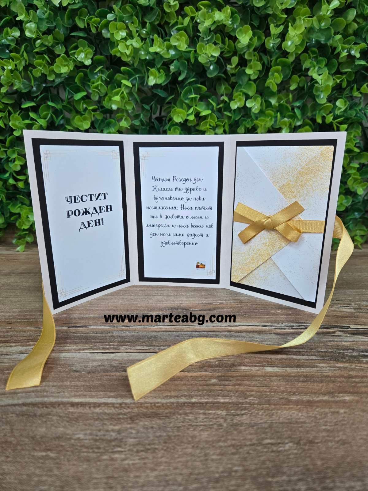 Картичката е изработена с три отделни секции, които позволяват красиво подреждане на послание и място за поставяне на паричен подарък. Допълнена е с декоративна панделка за по-елегантен завършек.