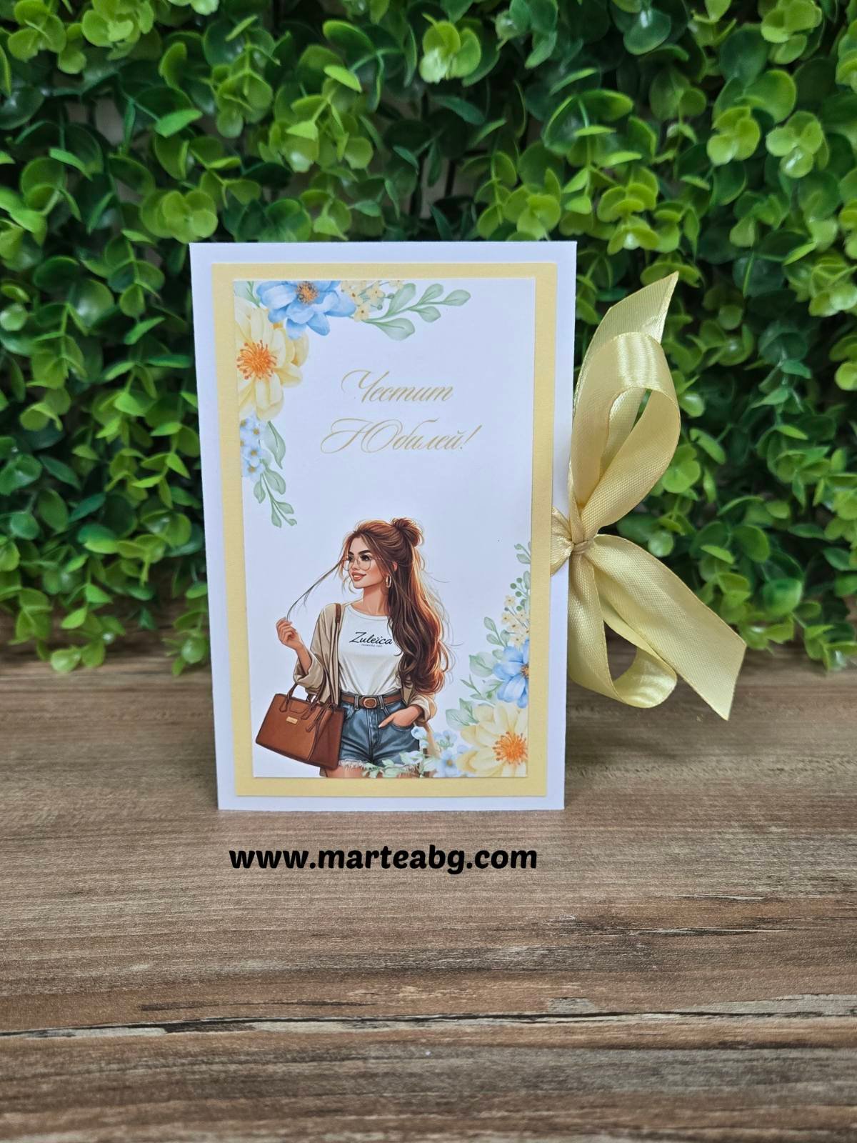 Текстът върху картичката може да бъде изработен по желание на клиента.