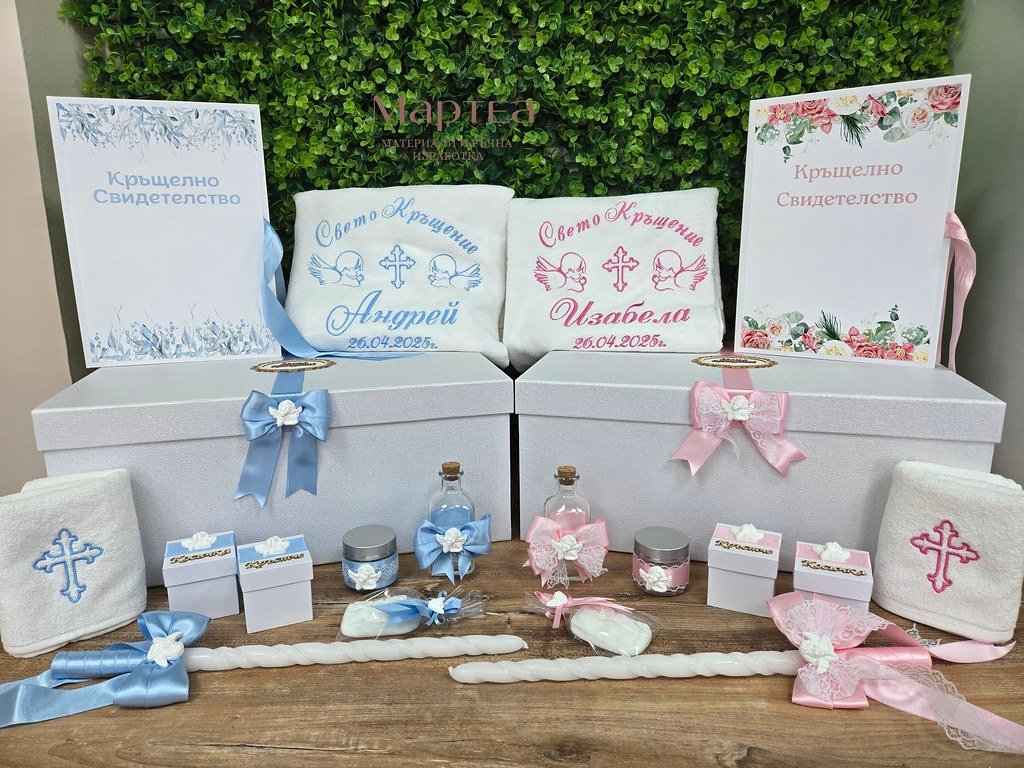 Елегантен и завършен комплект за кръщене, включващ всички необходими аксесоари, съчетани с внимание към детайла и стил. Елегантен и завършен комплект за кръщене, включващ всички необходими аксесоари, съчетани с внимание към детайла и стил. Подходящ избор както за родители, така и за кръстници.