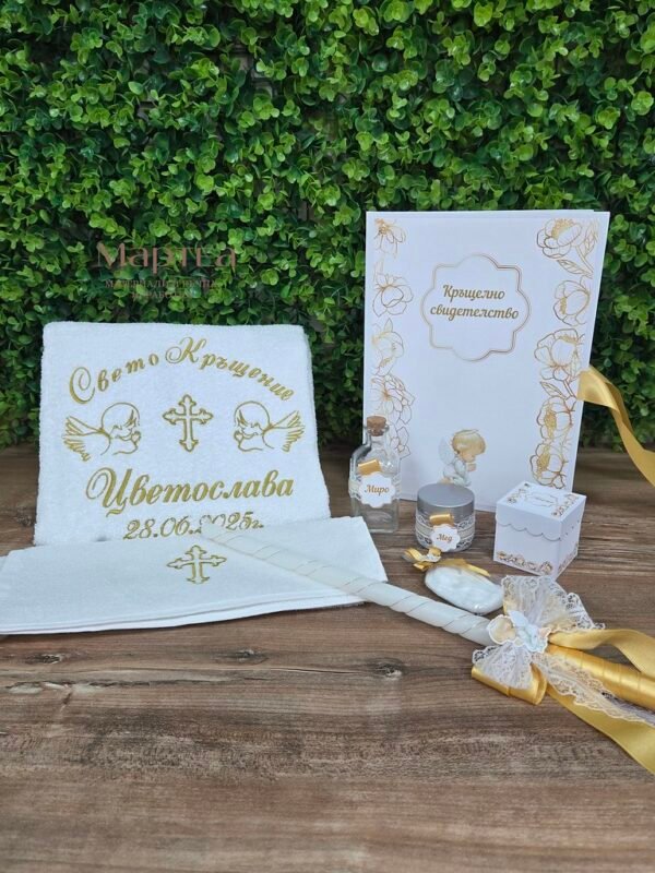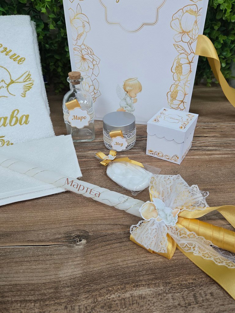 Елегантен и завършен комплект за кръщене, включващ всички необходими аксесоари, съчетани с внимание към детайла и стил. Подходящ избор както за родители, така и за кръстници. Комплектът за кръщене съдържа:
