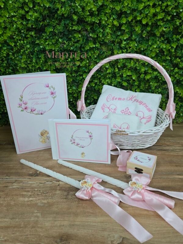 Елегантен и завършен комплект за кръщене, включващ всички необходими аксесоари, съчетани с внимание към детайла и стил. Подходящ избор както за родители, така и за кръстници.