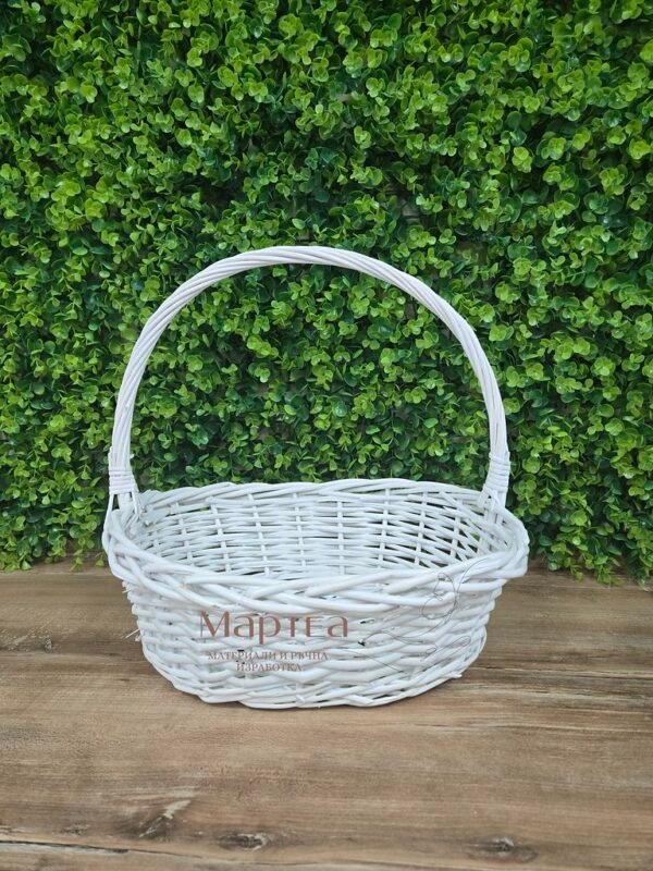 Бяла плетена кошница с елипсовидно дъно. Дължината на дъното е около 32 см, горната част е с дължина около 40 см, а височината с дръжката – приблизително 35 см.