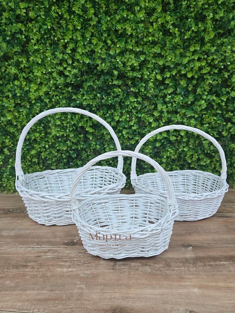 Бяла плетена кошница с елипсовидно дъно. Дължината на дъното е около 32 см, горната част е с дължина около 40 см, а височината с дръжката – приблизително 32 см.