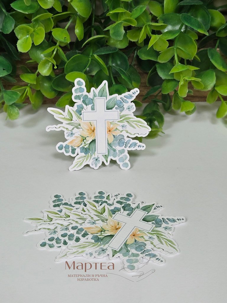 Декоративен картонен елемент във форма на кръст с цветя – прецизно изрязан от плътен, безкиселинен картон с гладка повърхност. Подходящ за скрапбукинг, картички, албуми, кутии и тематични декорации; може да се оцветява, лакира или наслагва за изразен 3D ефект. Лекият материал залепва лесно с лепило, двустранна лента или пяна точки и придава чист, професионален завършек на всеки творчески проект