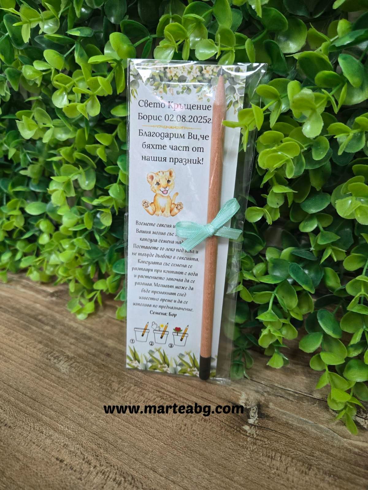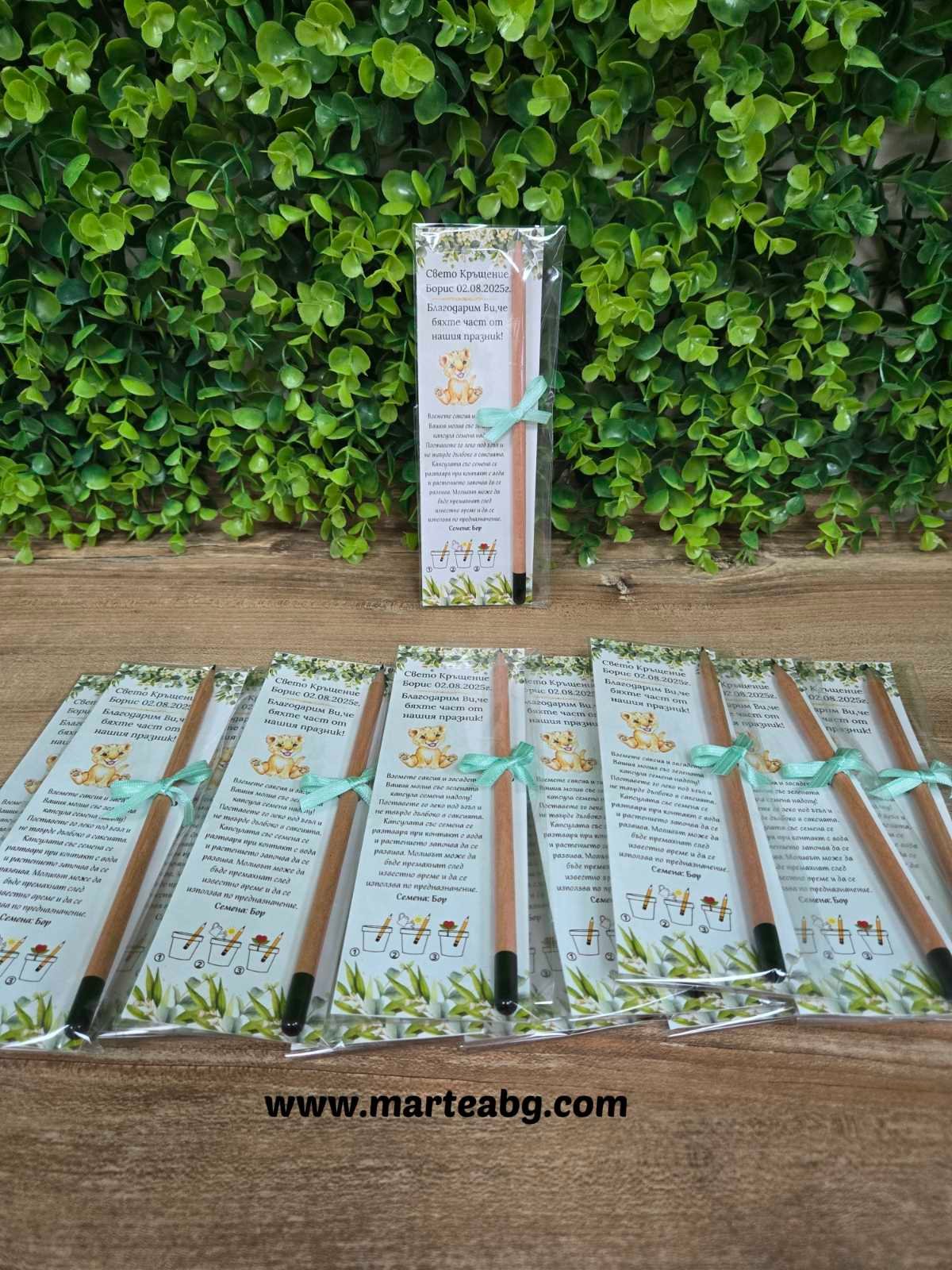 Моливът се поставя върху красиво картонче с инструкции, което може да бъде персонализирано според предпочитанията на клиента – темата на картончето се избира от вас, а персонализираният надпис се добавя чрез коментар при поръчка.