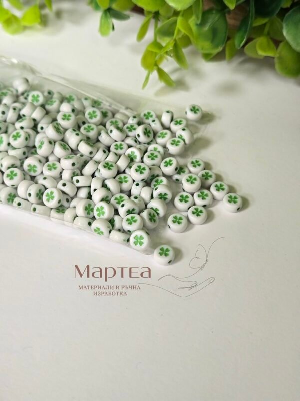 Мънисто във формата на детелина, с гладка и леко лъскава повърхност. Изработено от здрав материал, то придава жизнерадостен и артистичен акцент на гривни, колиета и обеци. Идеално за цветни и игриви бижута, които озаряват всяка визия.