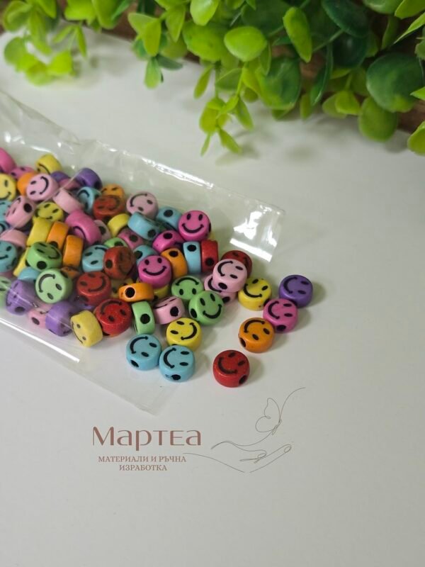 Мънисто във формата на усмихнато се личице в различни цветове, с гладка и леко лъскава повърхност. Изработено от здрав материал, то придава жизнерадостен и артистичен акцент на гривни, колиета и обеци. Идеално за цветни и игриви бижута, които озаряват всяка визия.