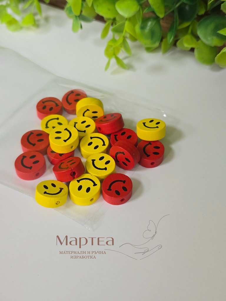 Мънисто във формата на усмивки в червен и жълт цвят, с гладка и леко лъскава повърхност. Изработено от здрав материал, то придава жизнерадостен и артистичен акцент на гривни, колиета и обеци. Идеално за цветни и игриви бижута, които озаряват всяка визия.