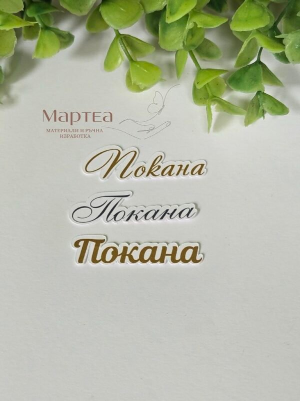 Декоративен картонен елемент във форма на надпис „покана“ – прецизно изрязан от плътен, безкиселинен картон с гладка повърхност. Подходящ за скрапбукинг, картички, албуми, кутии и тематични декорации; може да се оцветява, лакира или наслагва за изразен 3D ефект. Лекият материал залепва лесно с лепило, двустранна лента или пяна точки и придава чист, професионален завършек на всеки творчески проект