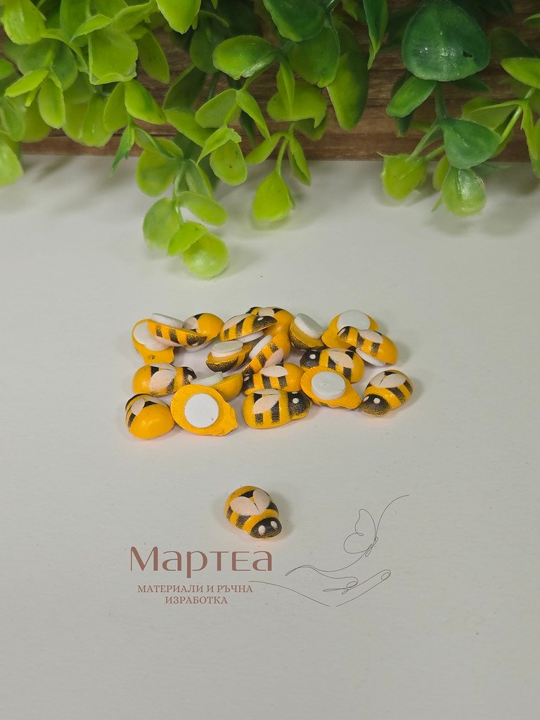 Дървен сувенир пчеличка с двойнозалепваща лепка. В опаковка са 20бр. Подходяща за хоби,арт и крафт материали и декорации. Размер: 1х1см.