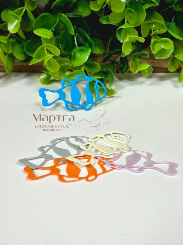 Декоративен картонен елемент във форма на рибки – прецизно изрязан от плътен, безкиселинен картон с гладка повърхност. Подходящ за скрапбукинг, картички, албуми, кутии и тематични декорации; може да се оцветява, лакира или наслагва за изразен 3D ефект. Лекият материал залепва лесно с лепило, двустранна лента или пяна точки и придава чист, професионален завършек на всеки творчески проект