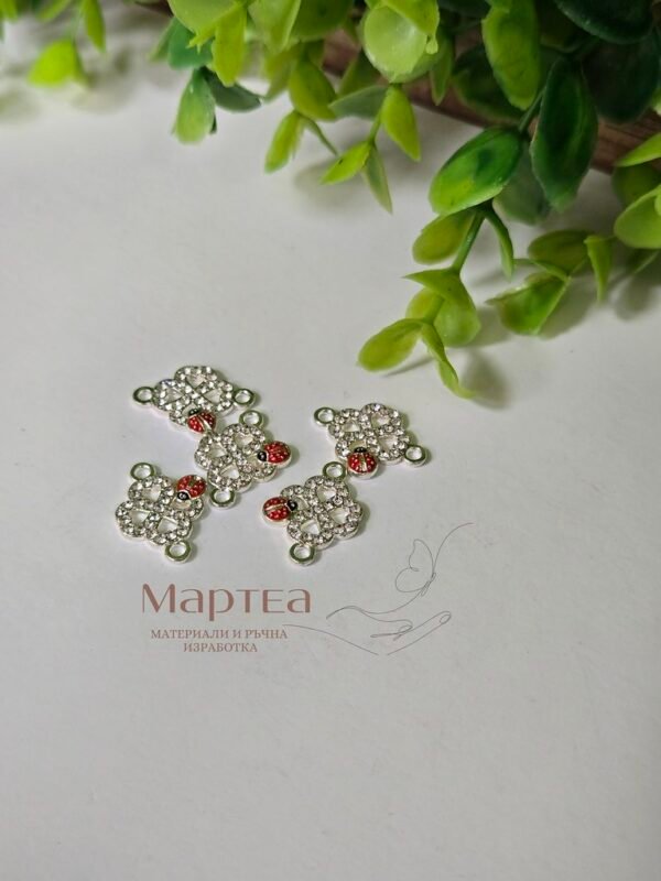 Свързващ елемент с формата на калинка в детелинка – декоративен елемент с отвор от двете страни, подходящ за свързване на части при изработка на гривни, колиета, мартеници и аксесоари. Изработен от лек метал с покритие, устойчиво на износване. Лесен за прикрепване с връв, корда или халки. Подходящ за ръчна изработка и тематични проекти.