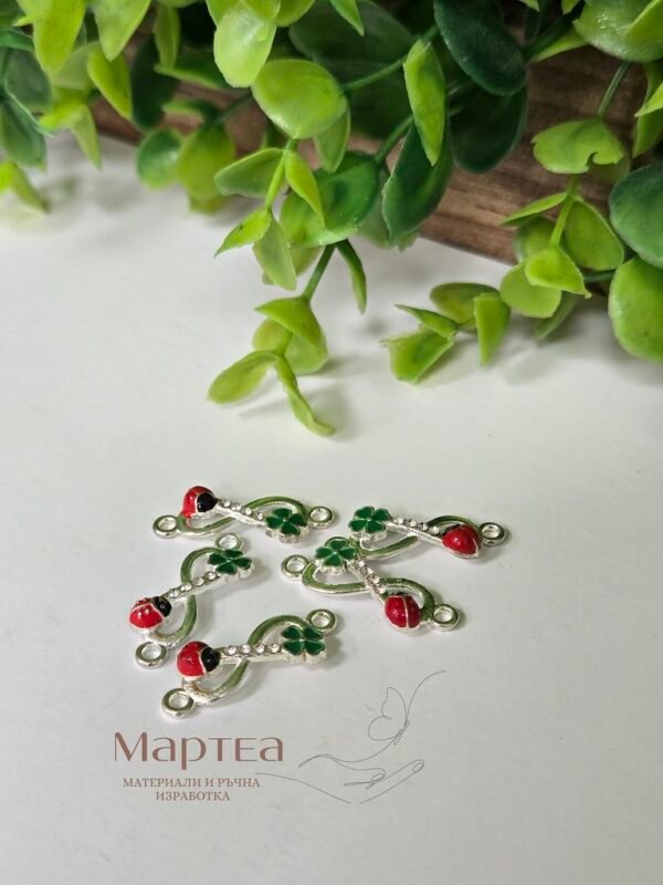 Свързващ елемент във формата на безкрайност с калинка и детелинка– декоративен елемент с отвор от двете страни, подходящ за свързване на части при изработка на гривни, колиета, мартеници и аксесоари. Изработен от лек метал с покритие, устойчиво на износване. Лесен за прикрепване с връв, корда или халки. Подходящ за ръчна изработка и тематични проекти.