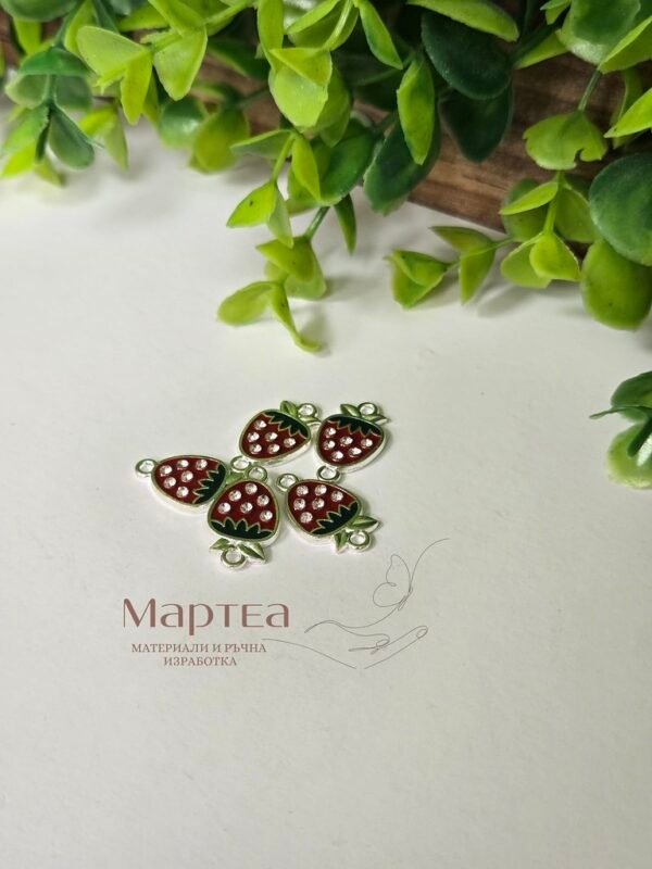 Свързващ елемент във формата на ягода с кристали – декоративен елемент с отвор от двете страни, подходящ за свързване на части при изработка на гривни, колиета, мартеници и аксесоари. Изработен от лек метал с покритие, устойчиво на износване. Лесен за прикрепване с връв, корда или халки. Подходящ за ръчна изработка и тематични проекти.