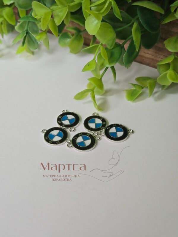 Свързващ елемент с емблемата на BMW – декоративен елемент с отвор от двете страни, подходящ за свързване на части при изработка на гривни, колиета, мартеници и аксесоари. Изработен от лек метал с покритие, устойчиво на износване. Лесен за прикрепване с връв, корда или халки. Подходящ за ръчна изработка и тематични проекти.