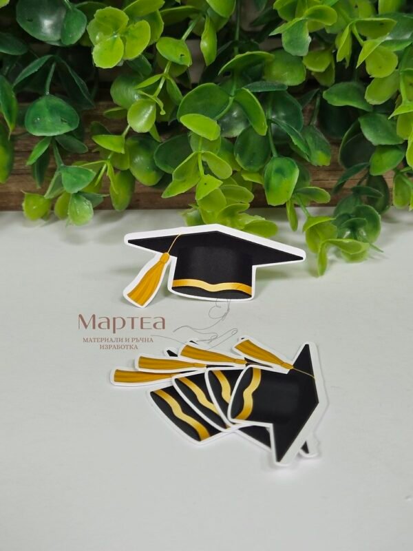 Декоративен картонен елемент във форма на шапка – дипломиране – прецизно изрязан от плътен, безкиселинен картон с гладка повърхност. Подходящ за скрапбукинг, картички, албуми, кутии и тематични декорации; може да се оцветява, лакира или наслагва за изразен 3D ефект. Лекият материал залепва лесно с лепило, двустранна лента или пяна точки и придава чист, професионален завършек на всеки творчески проект